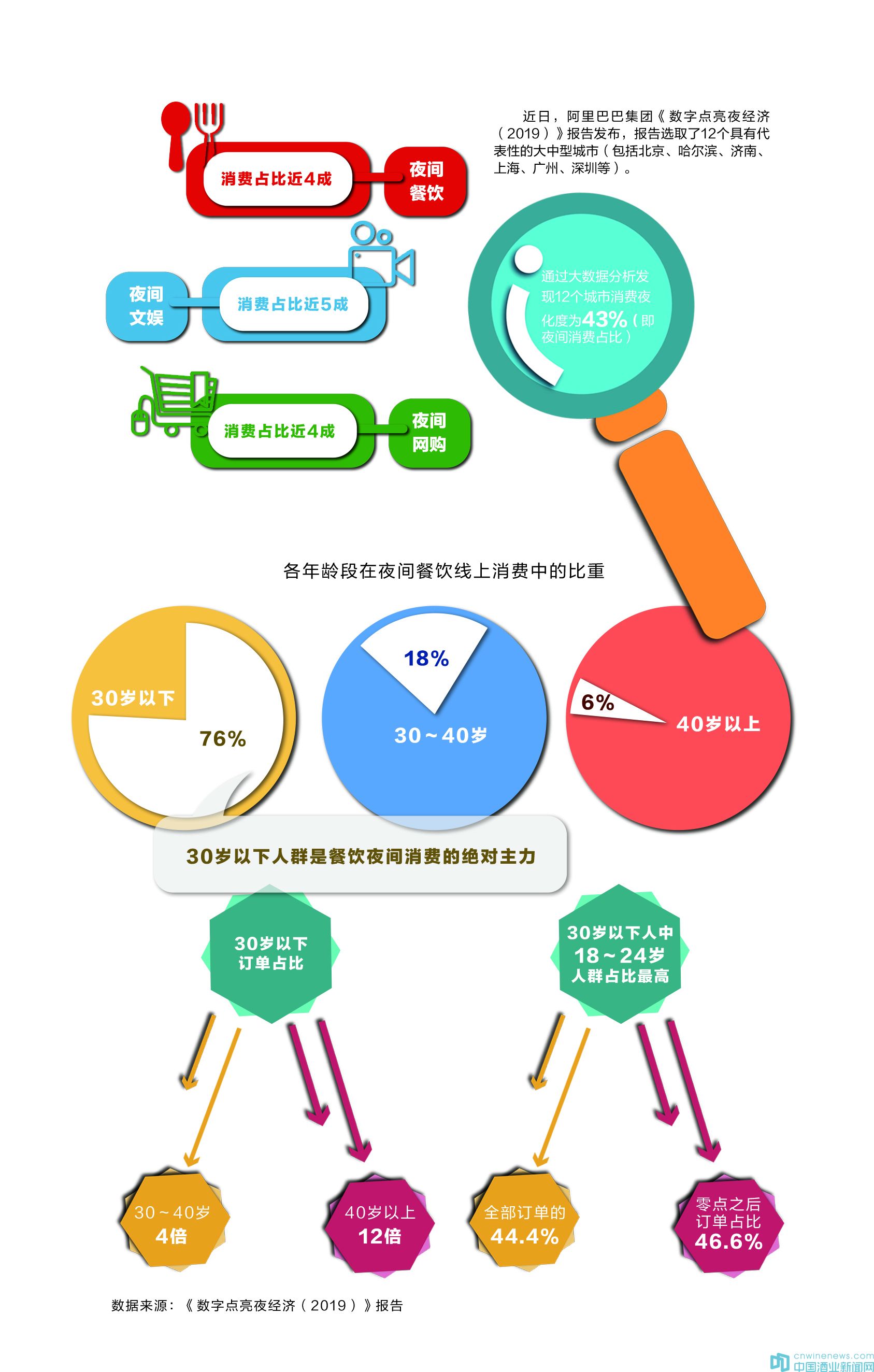 近日,阿里巴巴集團《數字點亮夜經濟(2019)》報告發布,報告選取了12個具有代表性的大中型城市(包括北京、哈爾濱、濟南、上海、廣州、深圳等),通過大數據分析發現,12個城市消費夜化度為43%(即夜間消費占比),其中,夜間餐飲消費占比近4成,夜間文娛消費占比近5成,夜間網購消費占比超4成。