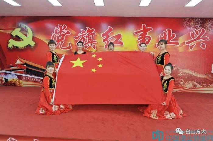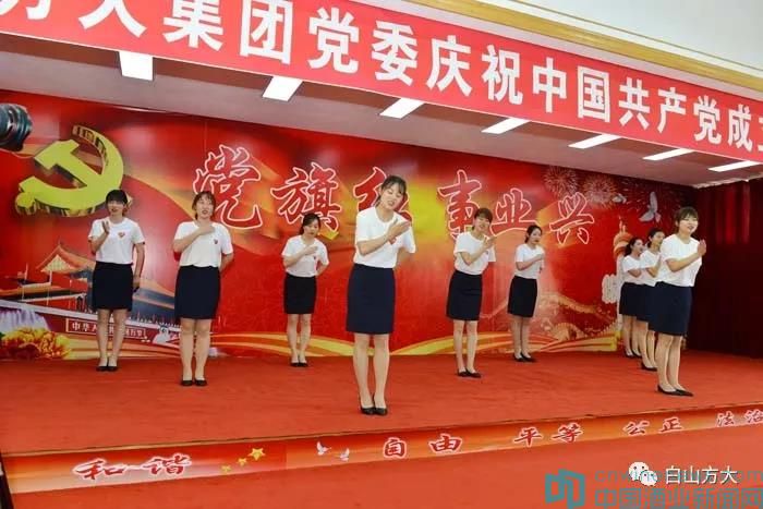 慶祝大會之后,白山方大集團的黨員和青年員工表演了精心準備的舞蹈《我和我的祖國》、手語舞《聽我說謝謝你》,大合唱《今天是你的生日,我的中國》《讓世界充滿愛》《我和我的祖國》《不忘初心》《祝福祖國》《唱支山歌給黨聽》等節目,他們用嘹亮的歌聲和優美的舞姿,熱情歌頌中國共產黨的豐功偉績,共同祝愿我們偉大的黨永葆年輕,在實現“兩個一百年”宏偉目標和中華民族偉大復興中國夢的征程上再創輝煌!