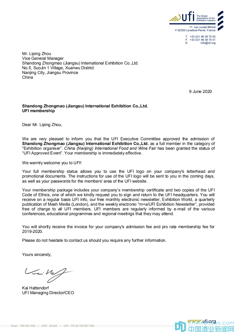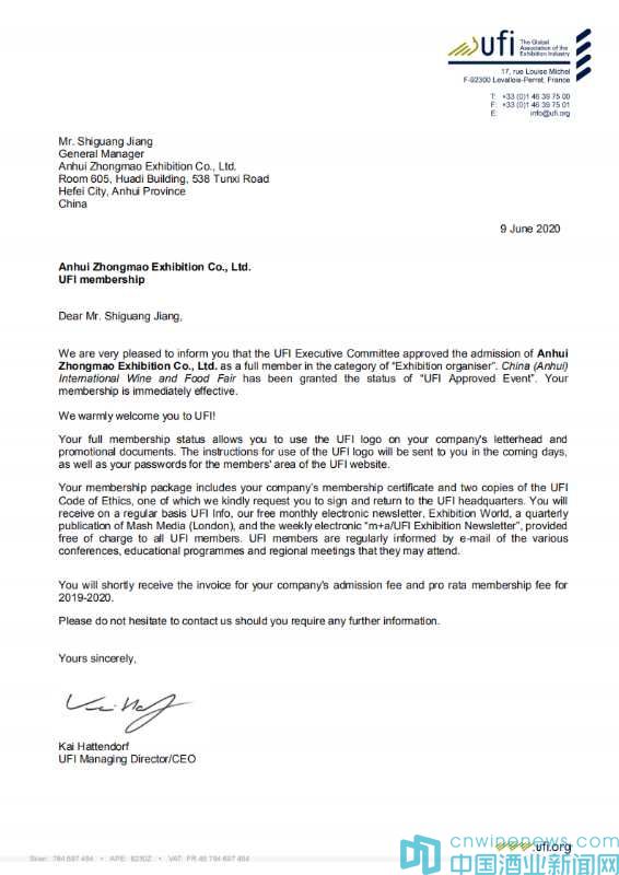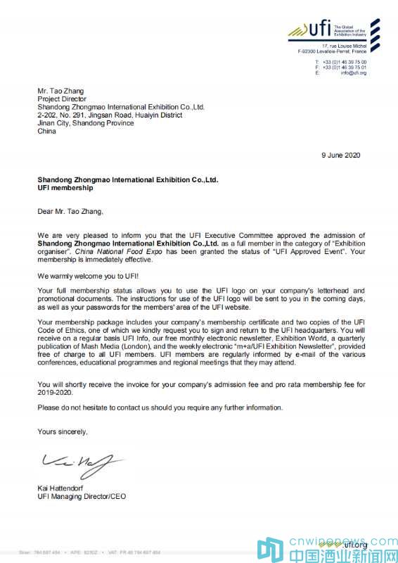 2020年6月9日,UFI(全球展覽業協會)巴黎總部傳來喜訊:中法合資高博中貿會展在山東、江蘇、安徽主辦的CNFE全國食品博覽會(濟南)、CNWFF中國(南京)國際糖酒食品交易會、CAWFF中國(安徽)國際糖酒食品交易會三展同時通過UFI(全球展覽業協會)認證,同時高博中貿會展在山東、江蘇、安徽三個子公司也通過UFI評審委員會的表決,分別正式成為UFI(全球展覽業協會)會員單位。通過UFI認證,是國際會展行業對主、承辦單位組織辦展能力的肯定,對展會在國際化、專業化、品牌化運營方面的充分認可。借助UFI認證展會的權威和影響,努力提升展會平臺新高度,助推會展經濟的快速發展。