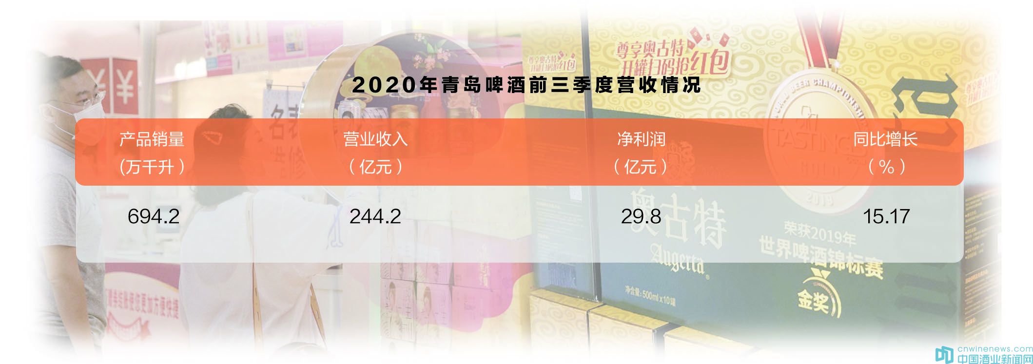 2020年前三季度,青島啤酒累計實(shí)現(xiàn)產(chǎn)品銷量694.2萬千升,實(shí)現(xiàn)營業(yè)收入244.2億元;實(shí)現(xiàn)歸屬于上市公司股東的凈利潤29.8億元,同比增長15.17%。