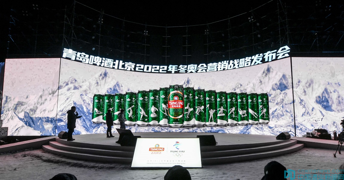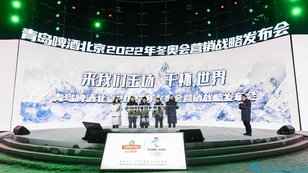 在發(fā)布會現(xiàn)場營造出的“冰雪長城”上,青島啤酒北京2022年冬奧會營銷戰(zhàn)略發(fā)布,“來我們主場 干杯,世界”青啤冬奧主題形象片也現(xiàn)場首發(fā)。