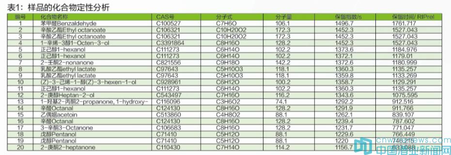 (表1)中列出了葡萄酒樣品中部分已定性出的物質,與(圖1)中的編號對應,包含化合物名稱、CAS號、分子式、分子量、保留指數、保留時間等信息,除去部分物質有單體、二聚體兩個峰,總共定性出42種化合物。
