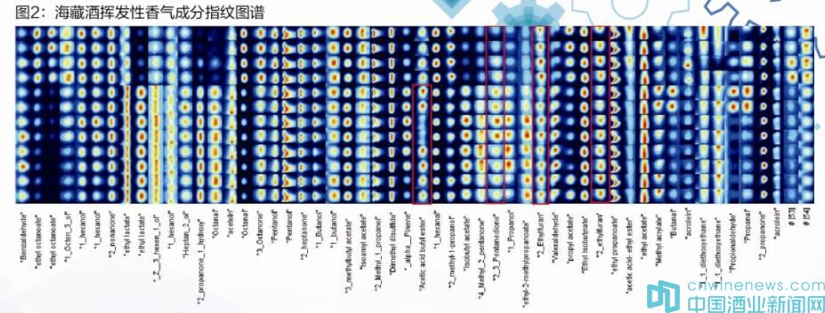 從(圖2)中,結合點的亮度和亮點面積大小可以初步推斷,經過海藏陳釀01號酒樣的主要變化表現為:辛酸乙酯、乙酸異戊酯、2-庚酮、2-甲基-1-丙醇、乙酸異丁酯、乙酸丙酯、丙酸乙酯,乙酸乙酯,丙烯醛等揮發性化合物的含量增加;苯甲醛、(Z)-3-己烯-1-醇、1-羥基-2-丙酮、2,3-戊二酮、正丙醇、異丁酸乙酯、正丁醛等揮發性化合物的含量降低。