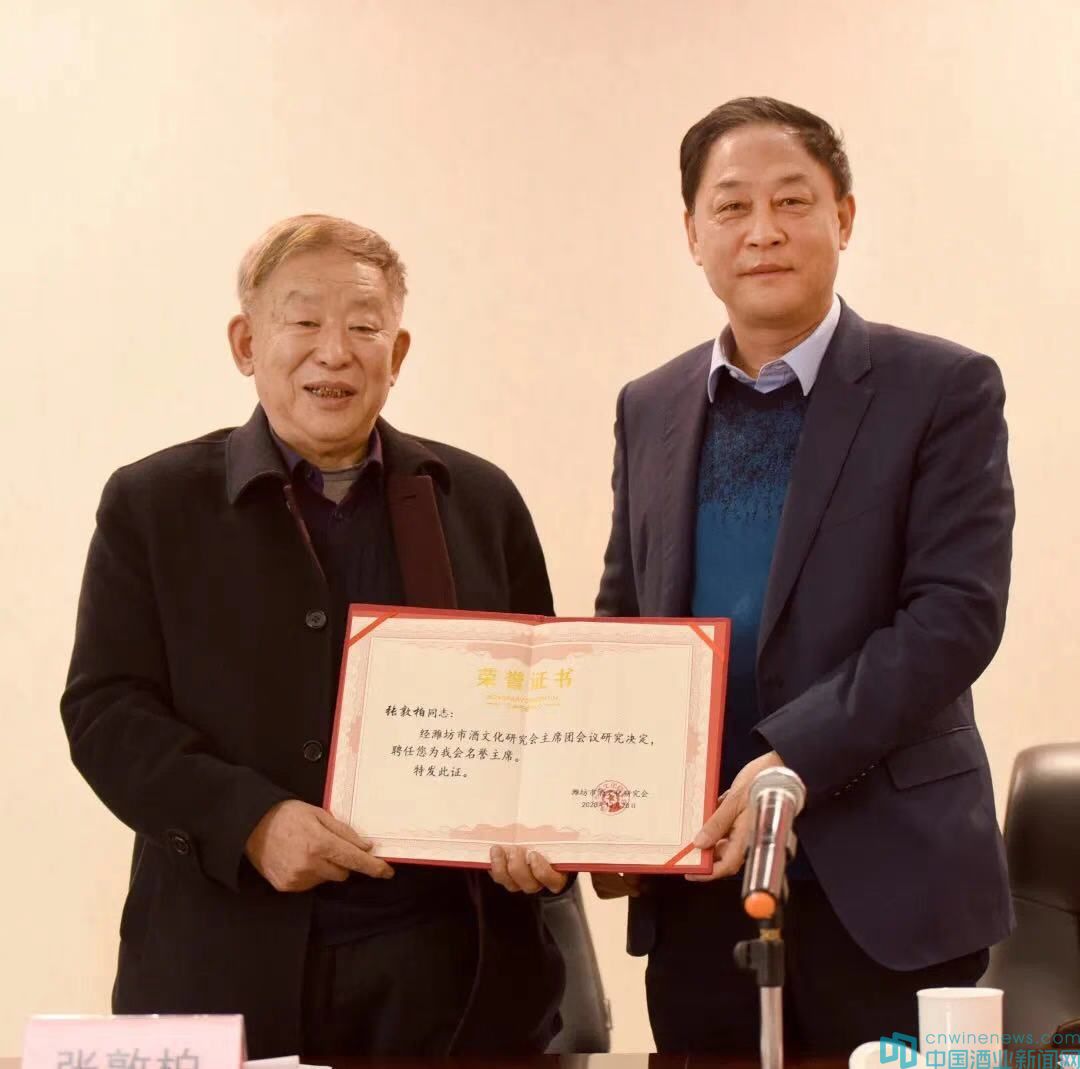 ?會(huì)上,首屆北方醬酒聯(lián)盟輪值主席、濰坊市酒文化研究會(huì)主席、山東青州云門(mén)酒業(yè)(集團(tuán))有限公司黨委書(shū)記、董事長(zhǎng)汲英民向?yàn)H坊市酒文化研究會(huì)原主席張敦柏授予濰坊市酒文化研究會(huì)名譽(yù)主席聘任證書(shū)。
