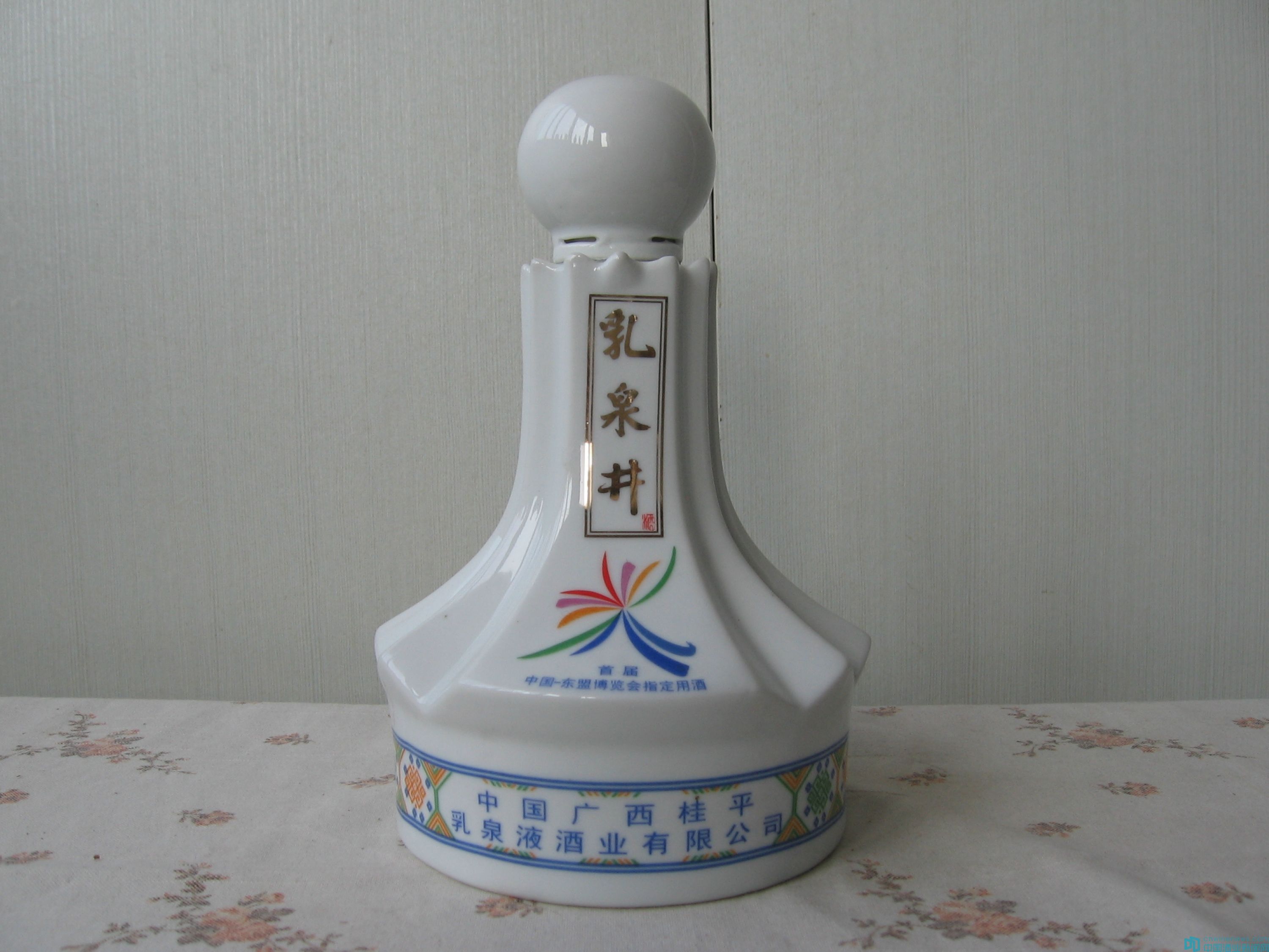 筆者收藏的乳泉井酒首屆中國-東盟博覽會紀念酒,酒包裝獨特,采用中國瓷都景德鎮(zhèn)燒制的瓷瓶,瓶型形制為中國—東盟博覽會永久會址、南寧國際會展中心主建筑多功能大廳穹頂,它也將南寧的市花朱槿與廣西標志性建筑—南寧國際會展中心有機地結(jié)合在酒器上呈現(xiàn),瓶內(nèi)盛裝以優(yōu)質(zhì)高粱、小麥為主要原料,采用傳統(tǒng)工藝,五十年老窖,配以現(xiàn)代科學技術(shù)釀造并經(jīng)陳年儲藏而成乳泉井酒,酒精度為52°,生產(chǎn)許可證編號:450015010445,產(chǎn)品標準號:GB/T10781.1,濃香型,容量為500ml,酒器正面“穹頂”“花瓣”處,有豎直鎏金的“乳泉井”三個字放在豎直雙層鎏金方框內(nèi),尤顯矚目,一個小2號的紅色“酒”字放在方框的右下角,向人說明里面盛裝的是酒;方框正下部位是中國-東盟博覽會會徽,會徽正下方居中燒制2行藍色楷體字“首屆”“中國—東盟博覽會指定用酒”,進一步說明該酒的用途。在底部正中圓弧處燒制了上下2行藍色楷體字“中國廣西桂平”“乳泉液酒業(yè)有限公司”,說明該酒的生產(chǎn)廠家。