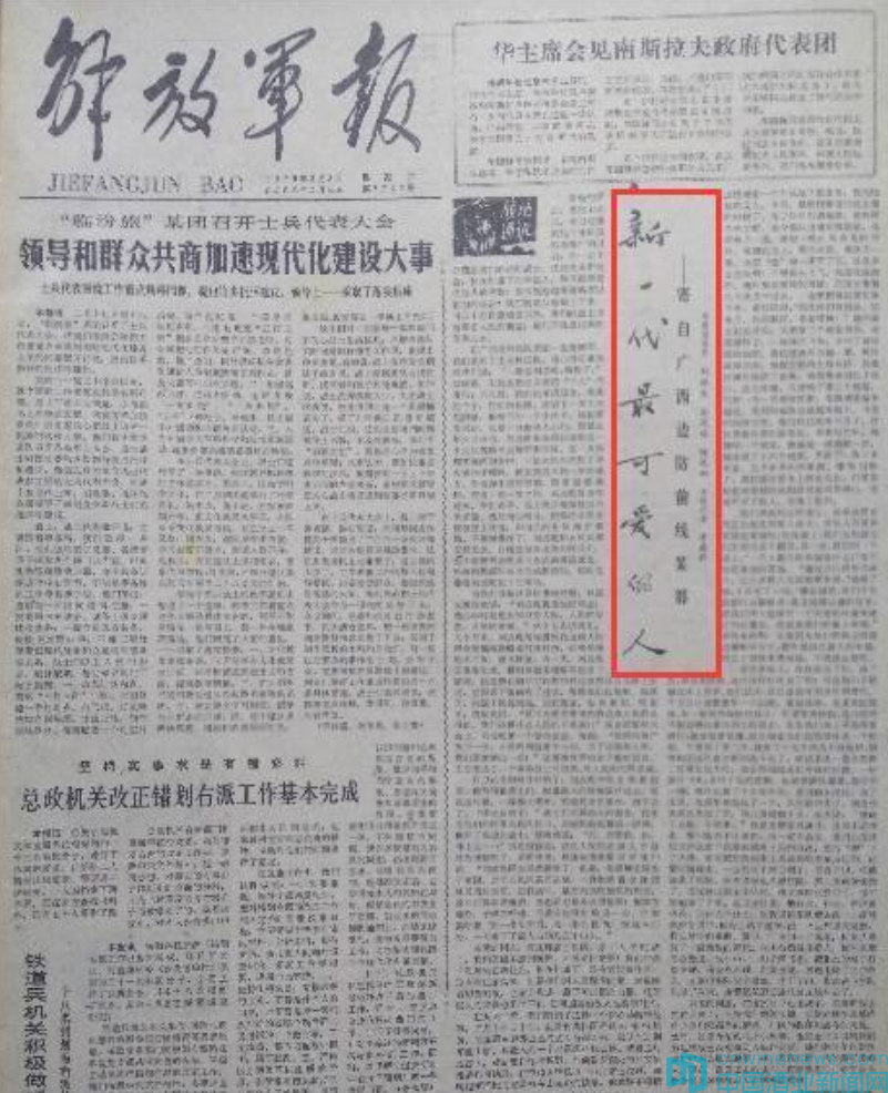 那么,這個“新一代最可愛的人”究竟是誰呢?“最可愛的人”這一表述,最早出自1951年4月11日《人民日報》頭版登載的《誰是最可愛的人》這篇通訊文章。文章反映的是中國人民志愿軍可歌可泣的英雄事跡,后來這篇文章被編寫進了教材,“最可愛的人”成了中國人民志愿軍的崇高代名詞,一時間傳遍大江南北,家喻戶曉。那么,“新一代最可愛的人”又指的是誰,兩者又有什么聯系呢?1979年3月3日,《解放軍報》頭版刊登戰地通訊文章《新一代最可愛的人——寄自廣西邊防前線某部》,報道了中國人民解放軍某軍的指戰員們英勇對越作戰并取得勝利的情況。文章動情地寫道:“我們的邊防戰士沒有辜負人民的期望,他們像當年赴朝作戰的中國人民志愿軍一樣,是我們新一代最可愛的人。”