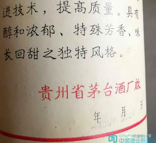 4、背標字體9行85字,帶紅色邊框,字體是魏碑,其中一句為“開展三大革命運動”。落款是“貴州省茅臺酒廠啟”,其中,“啟”字為繁體字。