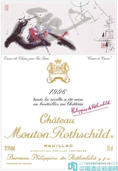 1996年對于波爾多來說是難得的好年份之一,這一年的波爾多葡萄酒受到了評論界廣泛的好評。1996年份的酒標設計,木桐酒莊選擇了與中國畫家兼書法家古干合作。該年份的酒標加入了中國書法的元素,采用水墨畫的方式描繪出五個不同顏色的“心”字,極富視覺沖擊又寓意深遠。