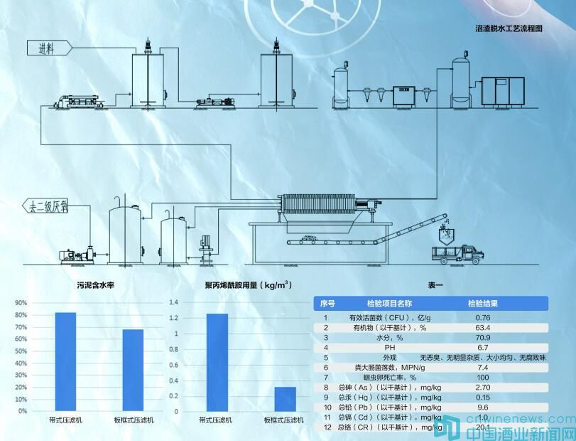 較帶式壓濾機,本公司更換成板框式壓濾機后,污泥脫水車間氣味明顯降低,壓縮后的沼渣含水量由之前的82%降至68%,日均耗水量減少3000m3,聚丙烯酰胺用量由之前的1.26kg/m3降至0.32kg/m3,操作人員數(shù)量由24人降至18人,由于配套設備的增多,耗電由0.6元/m3上升至2.0元/m3。由于沼渣含水量大幅降低,易于下游有機肥廠家加工,沼渣出售價格大幅度提高。