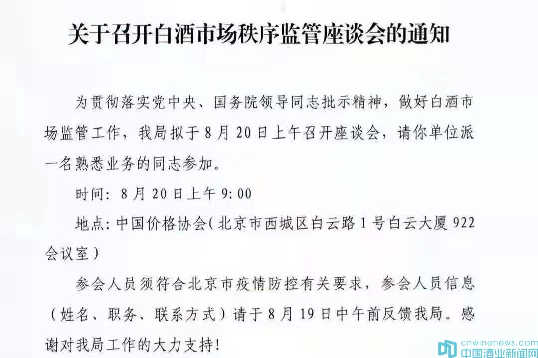據(jù)悉,8月18日,國(guó)家市場(chǎng)監(jiān)督管理總局價(jià)監(jiān)競(jìng)爭(zhēng)局發(fā)布的《關(guān)于召開白酒市場(chǎng)秩序監(jiān)管座談會(huì)的通知》。通知顯示,“為貫徹落實(shí)黨中央、國(guó)務(wù)院領(lǐng)導(dǎo)通知批示精神,做好白酒市場(chǎng)監(jiān)管工作,我局?jǐn)M于8月20日上午召開座談會(huì),請(qǐng)你單位派一名熟悉業(yè)務(wù)的同志參加。參會(huì)地址為中國(guó)價(jià)格協(xié)會(huì)。”