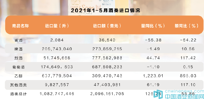 數據顯示,2021年1~5月,進口酒類總進口量108.27萬千升,進口額20.96億美元,量、額同比都有了大幅度增長。