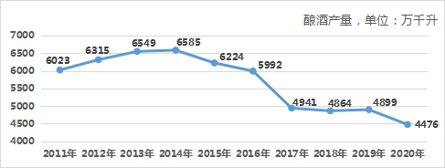 圖1:2011-2020年規模以上釀酒產量變化情況