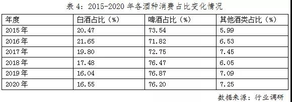 “十三五”期間,在消費升級的帶動下,酒類消費理念也隨之發生變化,“少喝酒、喝好酒”逐漸成為消費趨勢。我國酒類消費市場容量基本上到達頂點,規模穩定在5000萬千升左右(見表1)。