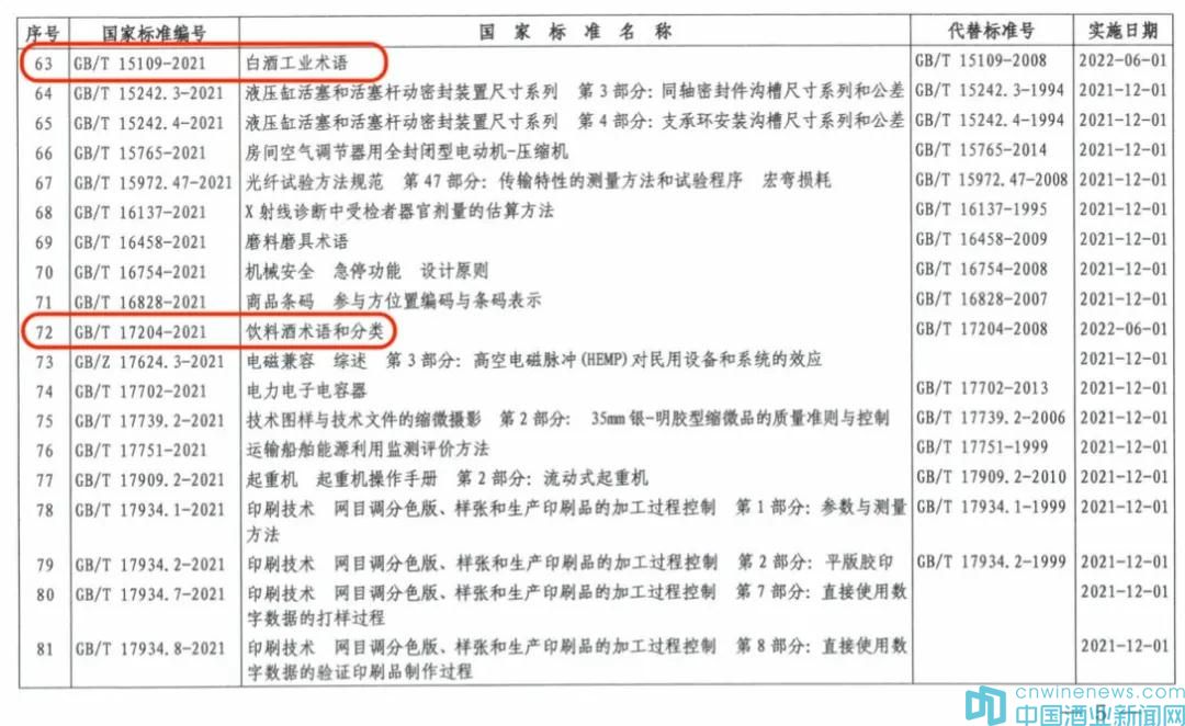 近日,國家市場監督管理總局(國家標準化管理委員會)發布了新修訂的飲料酒、白酒相關國家標準《GB/T 15109-2021白酒工業術語》(簡稱《白酒工業術語》)和《GB/T 17204-2021飲料酒術語和分類》(簡稱《飲料酒術語和分類》)。