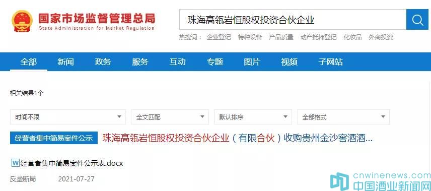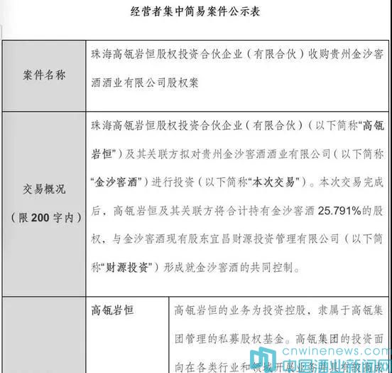 7月27日,國家市場監(jiān)督管理總局發(fā)布的經(jīng)營者集中簡易案件公示表中,對珠海高瓴巖恒股權(quán)投資合伙企業(yè)(有限合伙)收購貴州金沙窖酒酒業(yè)有限公司股權(quán)案進行公布。交易完成后,高瓴巖恒及其關(guān)聯(lián)方將合計持有金沙窖酒25.791%的股權(quán)。
