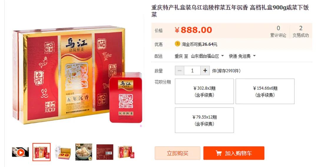 網(wǎng)傳888元的涪陵榨菜禮盒裝,為烏江榨菜推出的五年沉香禮盒裝。據(jù)稱在某些平臺(tái)其售價(jià)達(dá)到1500元。但是,《華夏酒報(bào)》記者發(fā)現(xiàn),京東旗艦店等網(wǎng)上平臺(tái)均已下架這款產(chǎn)品。在蘇寧易購(gòu)平臺(tái),也不見這款產(chǎn)品的蹤影,零售價(jià)達(dá)到152元-244元的禮盒裝榨菜產(chǎn)品則依然在列。