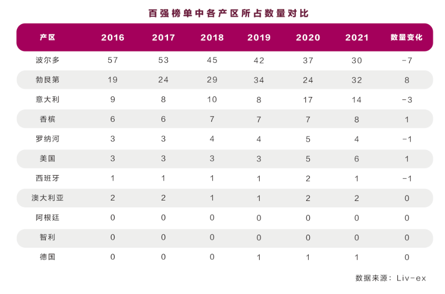 2020年,意大利成為百強榜單的“熱門話題”,達到了15.3%的歷史最高交易份額。這一年的榜單顯示了市場正在發生巨大變化。來自波爾多和勃艮第傳統大本營之外的品牌也取得了巨大飛躍。