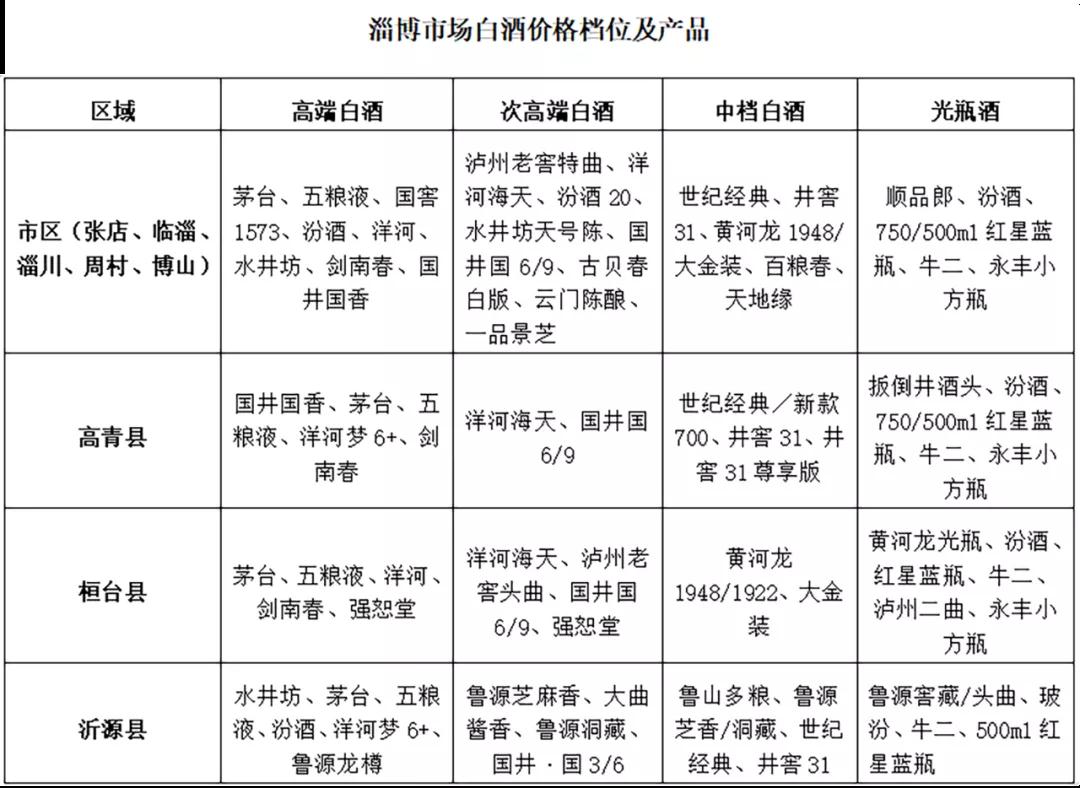 縱觀淄博市白酒市場,市場流行的本地品牌主要以扳倒井、黃河龍、百糧春、魯源、天地緣等中檔酒為代表;外來白酒以云門、景芝、古貝春等為代表;低檔白酒以牛欄山、永豐、紅星、龍江家園、魯源及地方小軍團(tuán)等為代表。高檔白酒有茅臺(tái)、五糧液、國窖1573、汾酒、水井坊、洋河等名酒。
