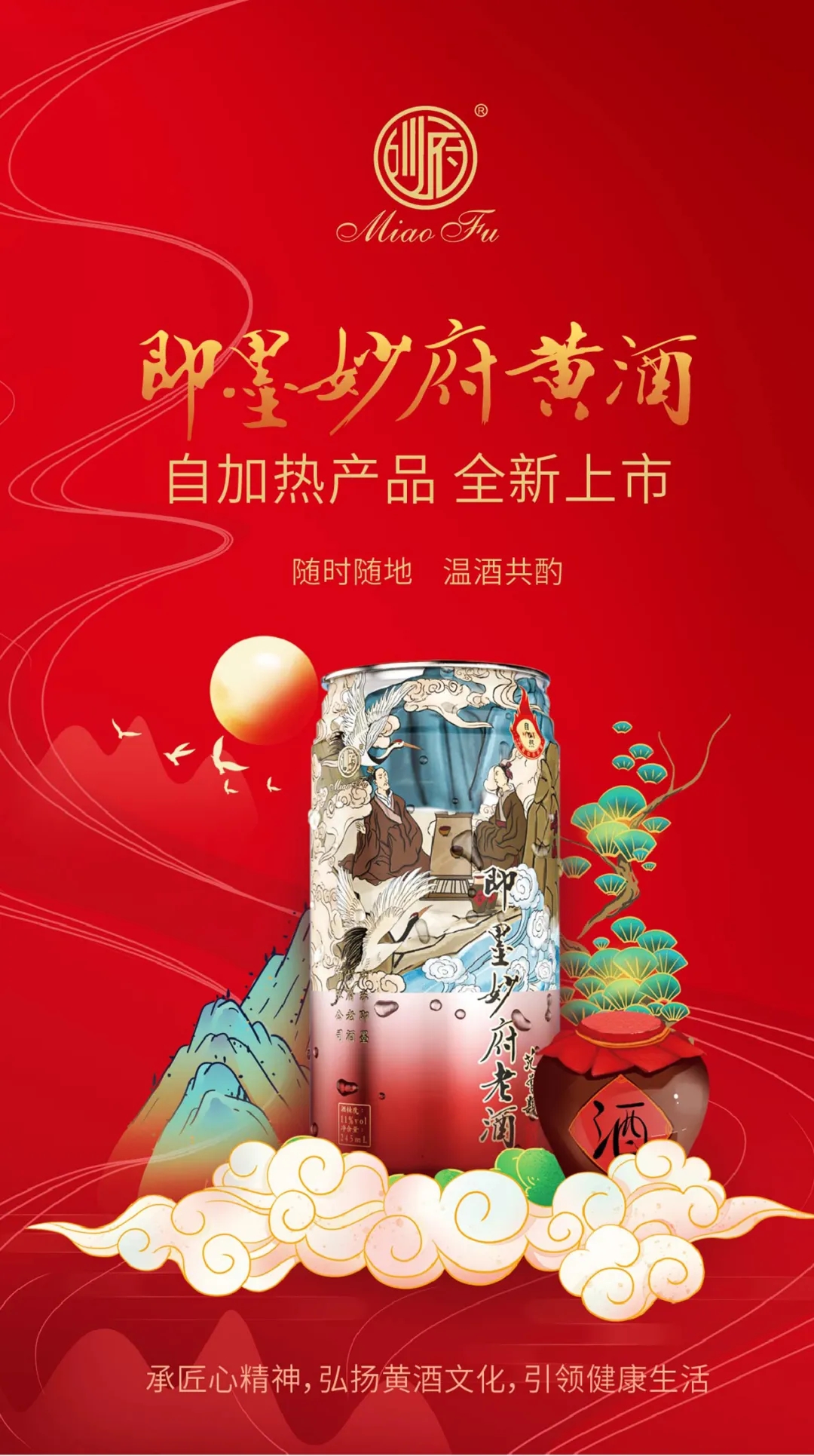 據悉,這款妙府自加熱黃酒采用網紅包裝,國風手繪水墨瓶身與潮流網紅配色的完美結合,特別采用經典手繪“齊景公朝拜嶗山仙境品酒圖圖”, 以傳統水墨技巧結合祥云、仙境,使得畫面祥和自然,嶗山仙境仿佛躍然而出,極具東方韻味;而創新自熱技術,巧妙實現了隨時隨地,瞬時自熱,讓老酒時時溫暖。需要時,只需將罐底底部凸起完全按壓至凹陷,然后上下快速晃動10秒,待罐體加熱裝置完全啟動加熱2分鐘之后即可飲用。全新自熱技術,節省了需要用壺燙酒的時間,以及之后的刷壺時間。并且由于精確的加熱溫度控制,妙府老酒自熱之后溫度可達50℃左右,恰好達到了黃酒飲用的最佳溫度,此時口感風味俱佳。妙府自加熱易拉罐,堪稱即墨妙府老酒為順應時代 發展推出的又一創新產品。