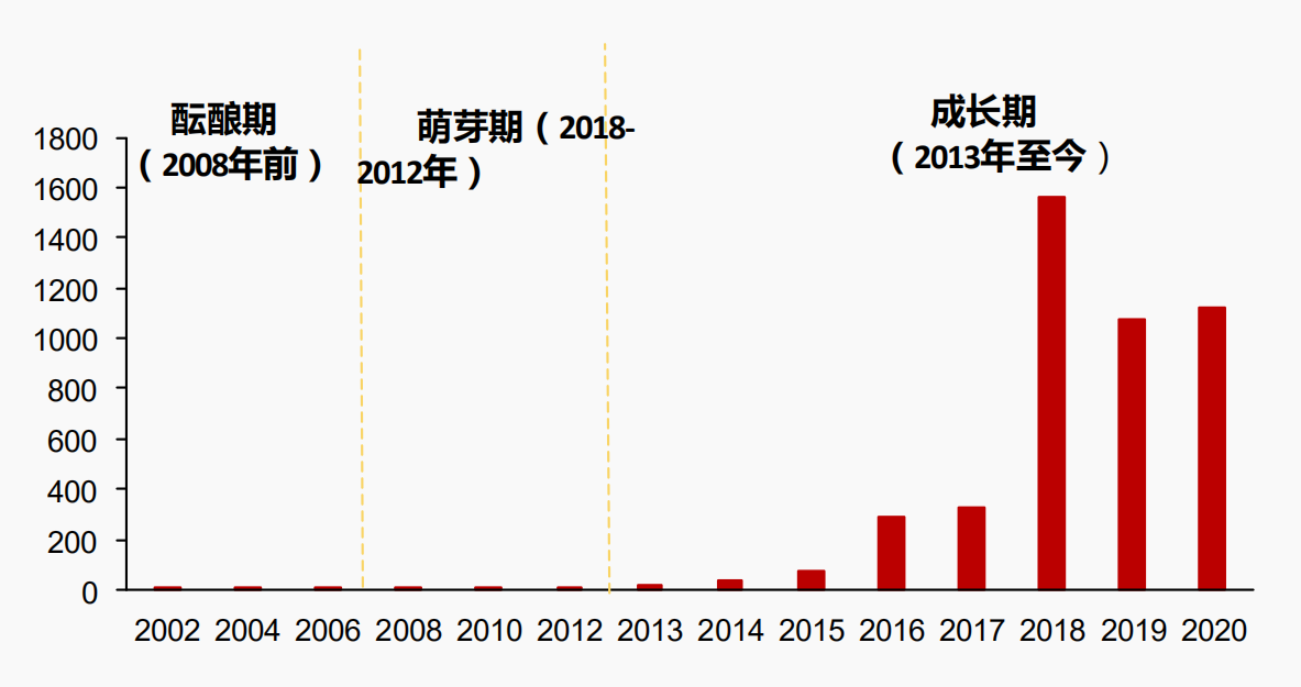 2008 年中國第一家真正的精釀啤酒釀造企業(yè)高大師啤酒工廠成立,隨后以豐收精釀、拳擊貓為代表的第一批精釀品牌出現(xiàn),并在一線城市逐步擴(kuò)張。此時(shí)的精釀啤酒產(chǎn)業(yè)規(guī)模較小,品牌獨(dú)立,市場滲透率低,消費(fèi)群體多集中于熟悉精釀文化的小眾圈層。