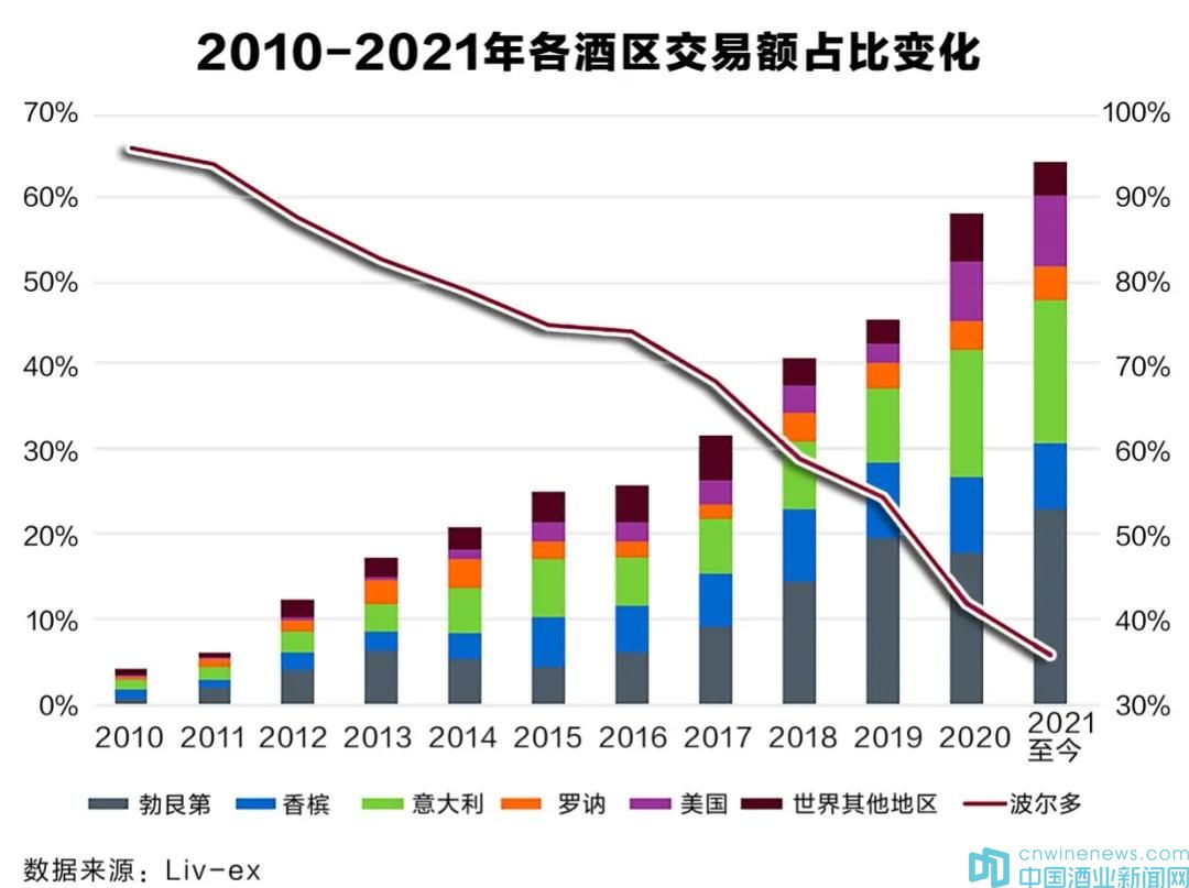 盡管仍然占主導(dǎo)地位,但波爾多在精品葡萄酒市場中所占的份額比以往任何時候都要小。從價值上看,其交易份額已從2010年的95.7%下降到年初至今的36.8%,部分原因是市場持續(xù)擴大。