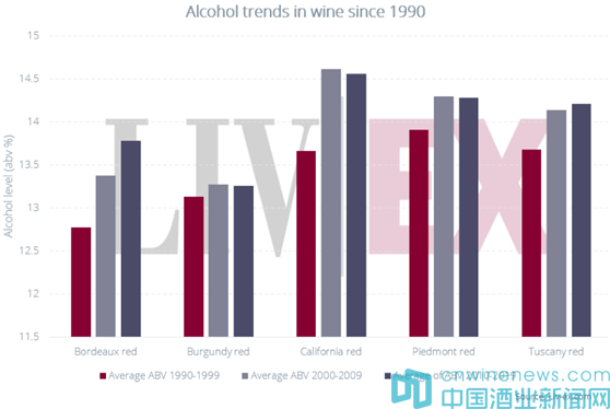 倫敦國際葡萄酒交易所(Liv-ex)的數(shù)據(jù)表明,在過去的 30 年里,精品葡萄酒中的酒精含量一直在上升。從 2020 年起,Liv-ex 開始記錄和驗(yàn)證葡萄酒的酒精含量值。迄今為止,它已經(jīng)記錄了35000款葡萄酒的酒精含量,其中近20000種已經(jīng)過倉儲(chǔ)團(tuán)隊(duì)的核對(duì),他們對(duì)葡萄酒一一進(jìn)行了檢查。