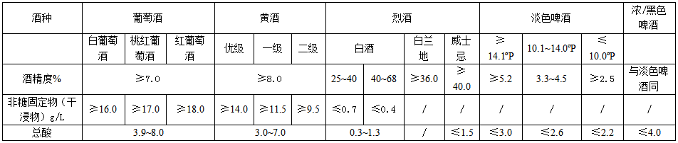 注:數據來自上述酒類的國家標準和相關論文,其中黃酒為稻米黃酒數據,總酸以乳酸計;白酒為濃香白酒數據,總酸含量以乙酸計;啤酒總酸含量單位為ml/100mL,oP為原麥汁濃度。