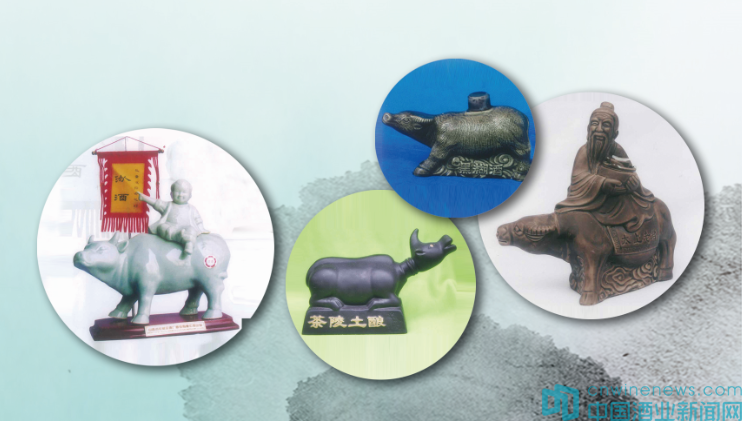“茶陵土釀”為茶陵的地方酒品。茶陵為歷史名城,尊儒厚學,名勝古跡較多。這里有一段保存完好的南宋城墻,城墻一側,有一涼亭,亭內坐著一條與城墻一樣古老的獨角鐵牛,體重700公斤,歷經800年風雨,居然不銹不蝕,真是奇跡。此牛頭顱高揚,金色的雙眼目光炯炯,仰視著蒼天,守護著古城……“茶陵土釀”瓶的造型就是茶陵鐵牛的翻版,牛身為儲酒器,牛身與牛頭相接處就是倒酒的口子,瓶側有“茶陵土釀”的字樣。酒瓶為陶質,鐵黑色,正是獨角鐵牛的顏色,顯得穩重滄桑,有種歷史的厚重感。