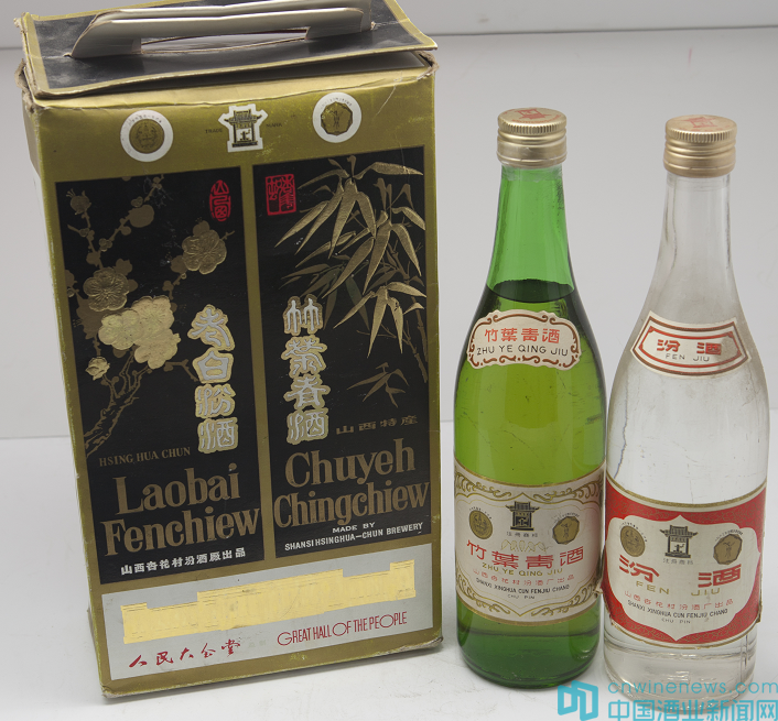 所以,我對汾酒廠和汾酒以及汾竹禮盒的情懷一直很深,它是我走向職業道路的開始。在后來的收集中,我還發現了比1993年那款更早的汾竹禮盒,里面裝的是小螺旋金屬蓋的汾酒和竹葉青酒(見圖二,1986年出品的人民大會堂專供汾竹禮盒,其中汾酒60度,竹葉青酒45度)。
