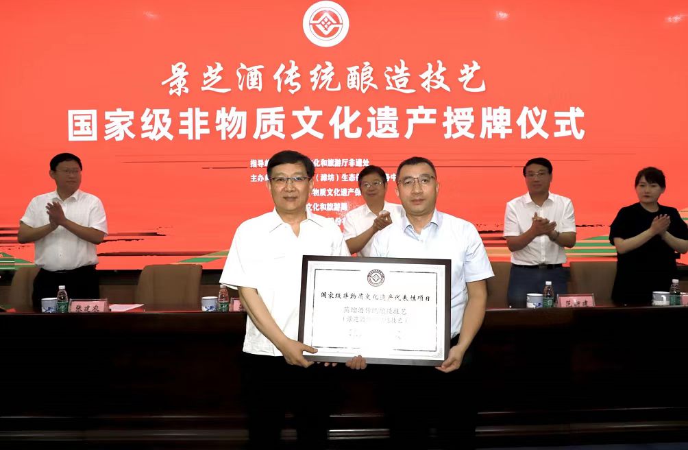7月17日,由山東省文化和旅游廳指導,齊魯文化(濰坊)生態保護區服務中心、濰坊市非物質文化遺產保護協會、安丘市文化和旅游局主辦的“景芝酒傳統釀造技藝? 國家級非物質文化遺產授牌儀式”在齊魯酒都景芝舉行。