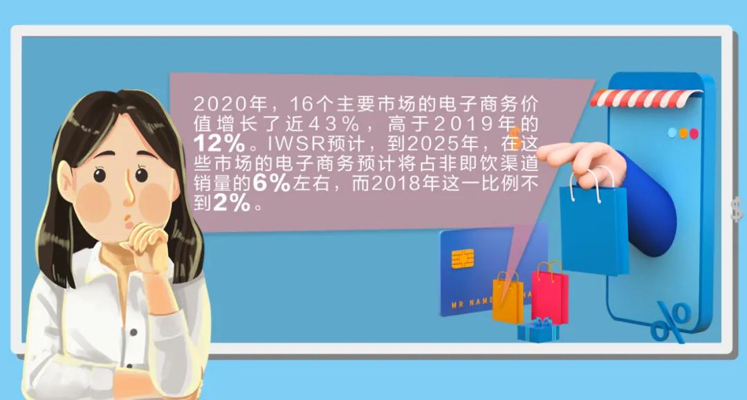 2020年,16個主要市場的電子商務價值增長了近43%,高于2019年的12%。IWSR預計,到2025年,在這些市場的電子商務預計將占非即飲渠道銷量的6%左右,而2018年這一比例不到2%。