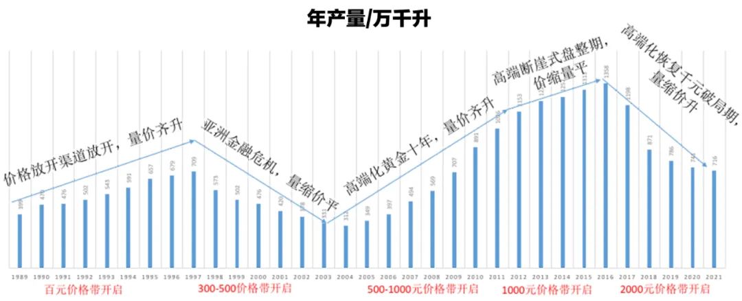 從2016年以來,白酒行業在產量持續下滑過程中,一直處于量縮價升的狀態,市場的集中化趨勢越來越明顯,白酒行業的總產量已經從1358.4萬千升降到2021年的716萬千升,年產量已經跌了47.3%,可以說,白酒行業的年產量近乎腰斬。2016年白酒行業規模以上企業1578家,2020年規模企業1040家,減少了538家,34.1%的規模企業在過去5年被行業淘汰出局,平均每年100多家規模企業消亡。