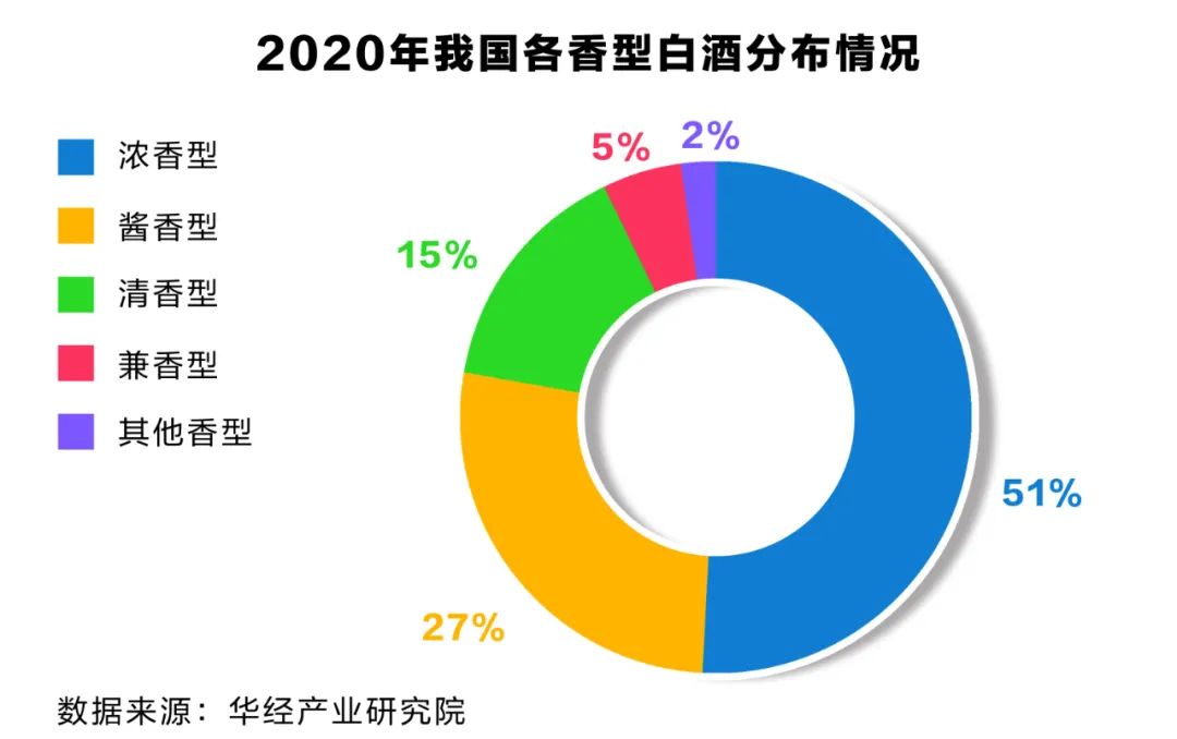 中國白酒香型,按照市面上的劃分,有十三種,分別是:醬香型、清香型、濃香型、董香型、兼香型、鳳香型、米香型、豉香型、蒙牧型、芝麻香型、四特香型、老白干型、馥郁香型。雖然中國白酒的香型眾多,各香型的市場細分比較鮮明,但是真正影響白酒行業發展的還是主流的三大香型,濃香、醬香和清香白酒,市場銷售額占比超過90%以上。
