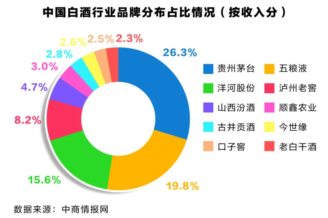 新冠疫情發生前,次高端及以上的酒企享受擠壓式增長紅利的邏輯已有跡象,高端酒賽道內龍頭集中的格局已是定論,而疫情所帶來的新變化是次高端板塊內部的分化。數據顯示,我國白酒行業按收入分,占比最大的品牌為貴州茅臺,其次為五糧液、洋河股份和瀘州老窖、汾酒,分別占比26.3%、19.8%、15.6%、8.2%、4.7%。
