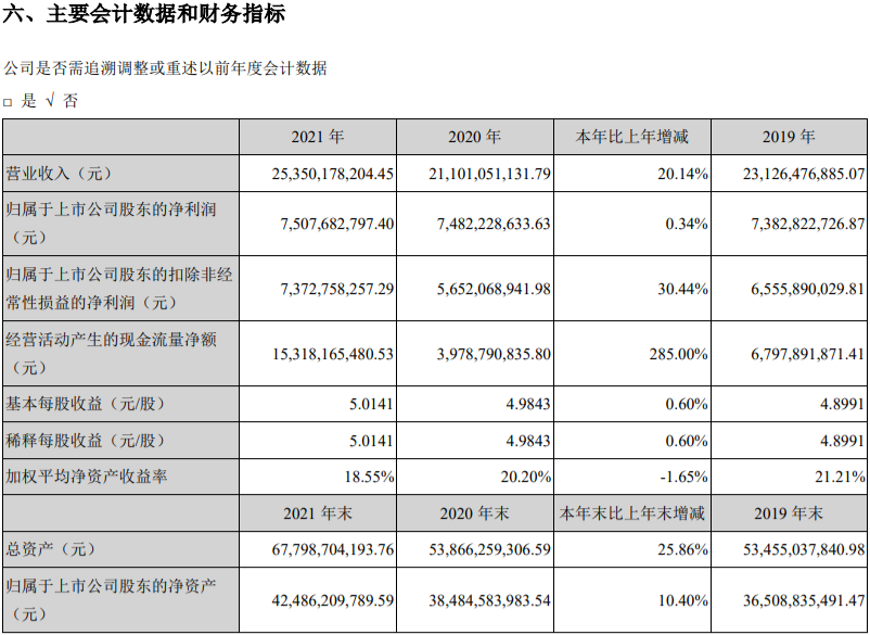 2021年年報顯示,洋河股份在當年度實現營業收入253.50億元,同比增長20.14%;歸母凈利75.08億元,同比增長0.34%。