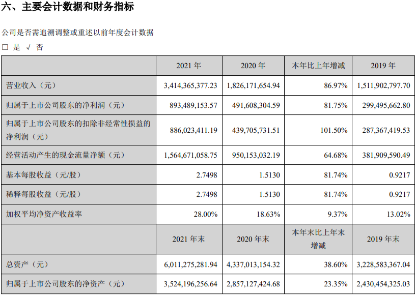 4月28日,酒鬼酒發布2021年年度報告。年報顯示,2021年酒鬼酒實現營收34.14億元,同比增長86.97%;實現凈利8.93億元,同比增長81.75%。