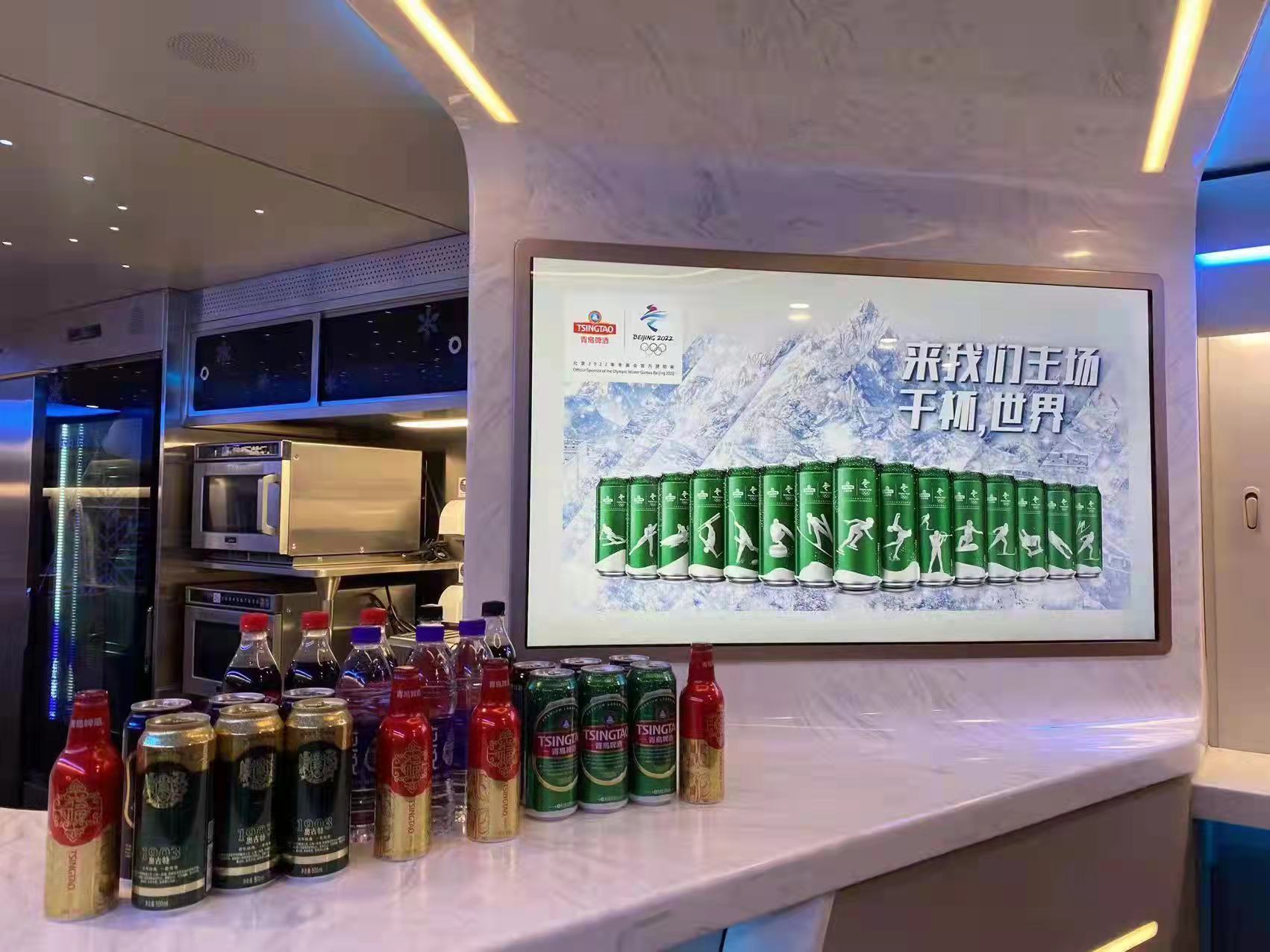 而在如此“科技感”爆棚的冬奧專列,作為北京冬奧會官方贊助商,青島啤酒多款產品也齊齊亮相,為這條冰雪專列增加“中國味道”。