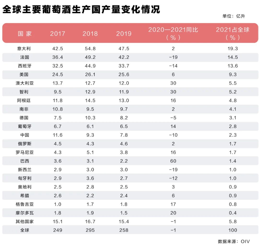 2021年,全球葡萄酒產量260億升,較2020年下降了近1%,至此已連續3年略低于10年平均水平。