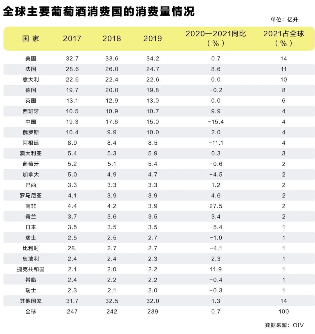 2021年全球葡萄酒消費236億升,較2020年增長了0.7%。美國仍然是全球最大葡萄酒消費國,2021年的消費量33.1億升。