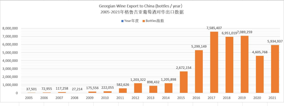 2005-2021年格魯吉亞葡萄酒對華出口數據及圖表(數據來源:格魯吉亞國家葡萄酒局):