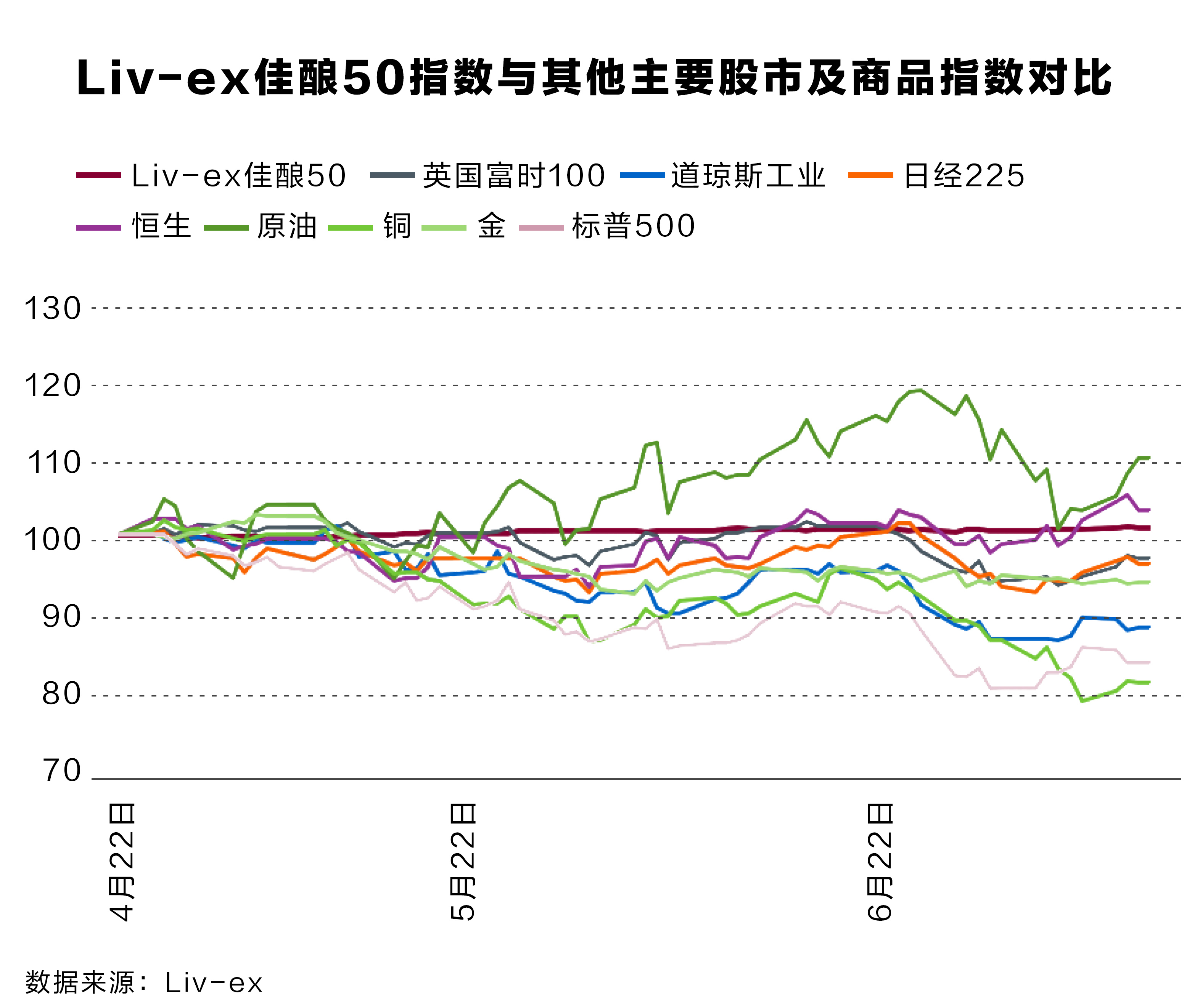 過去幾個月,通脹猖獗、全球燃料危機、對經濟衰退的擔憂和央行財政緊縮導致股票和債券市場暴跌。但Liv-ex表示,精品葡萄酒的表現明顯優于全球股市和大多數大宗商品。
