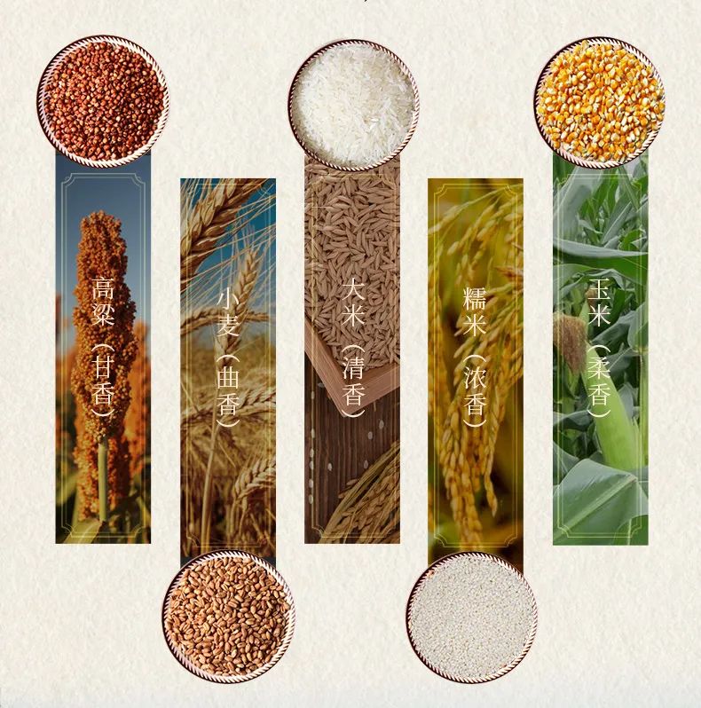 每一瓶都采用高粱(甘香)、大米(清香)、糯米(濃香)、小麥(曲香),玉米(柔香)