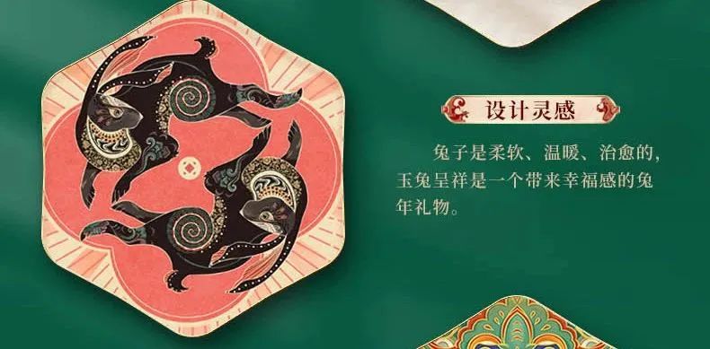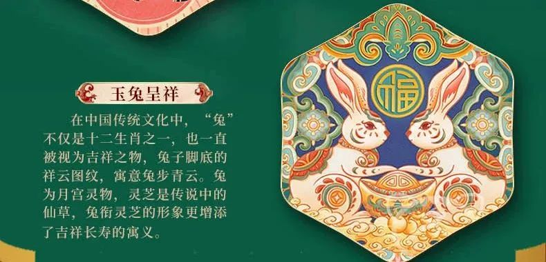 在中國傳統文化中,“兔”不僅是十二生肖之一,也一直被視為吉祥之物,兔子腳底的祥云圖紋,寓意兔步青云。兔為月宮靈物,靈芝是傳說中的仙草,兔銜靈芝的形象更增添了吉祥長壽的寓義。