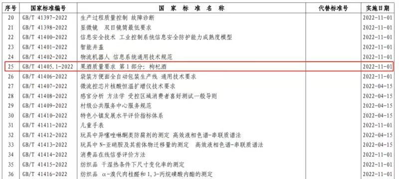 根據國家市場監督管理總局(國家標準化管理委員會)公告(2022年第6號),其中,由寧夏紅枸杞產業有限公司于2014年提出標準起草立項,并于當年列入《國家標準委關于下達2014年第一批國家標準制修訂計劃通知》(國標委綜合〔2014〕67 號),由寧夏紅公司、中國食品發酵工業研究院等單位主要負責起草,全國釀酒標準化技術委員會歸口制定的GB/T 41405.1-2022《果酒質量要求 第1部分:枸杞酒》國家標準,于2022年11月1日正式實施。