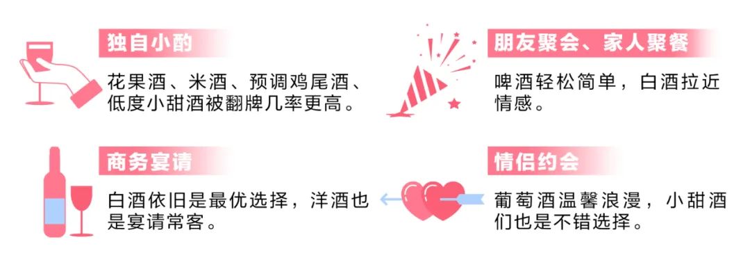 在所有飲酒場景中,白酒、啤酒、葡萄酒都是主流選擇,但在具體場景下消費者也會有不同側重。