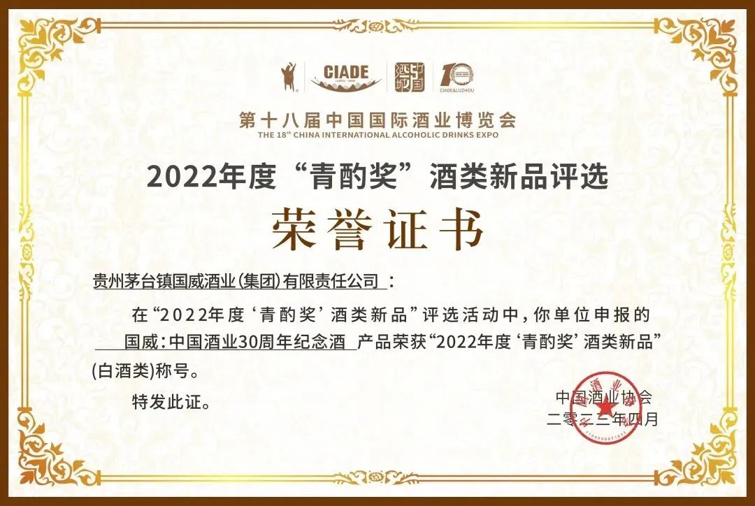 4月,在2022年度酒類新品頒獎盛典上,國威酒業榮獲中國酒業最高榮譽 “青酌獎”。并于同月,再收獲中國醬香白酒核心產區(仁懷)醬酒包裝設計優秀獎。