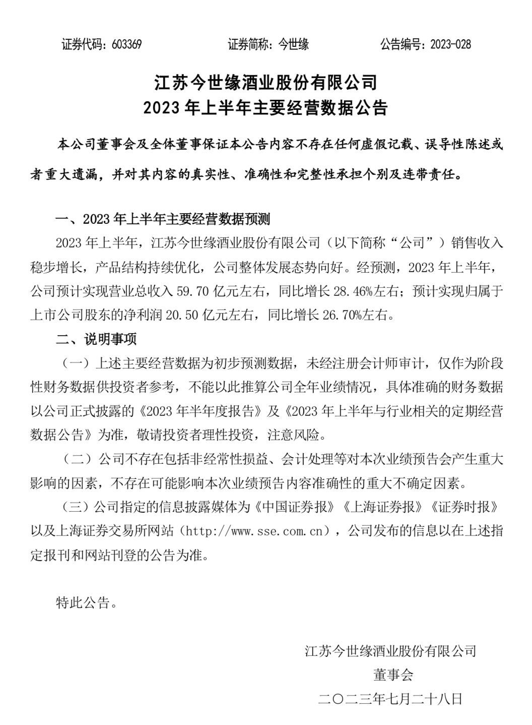 7月27日,今世緣發布上半年主要經營數據公告稱,經預測,2023年上半年,江蘇今世緣酒業股份有限公司預計實現營業總收入59.70億元左右,同比增長28.46%左右;預計實現歸屬于上市公司股東的凈利潤20.50億元左右,同比增長26.70%左右。