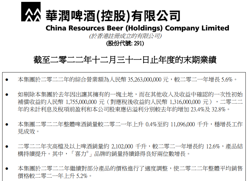啤酒整體銷量為11,096,000千升,同比上升0.4%。其中,次高檔及以上啤酒銷量增長12.6%,喜力品牌銷量錄得良好兩位數增長。去年公司繼續對部分產品價格調整,使整體平均售價上升5.2%。