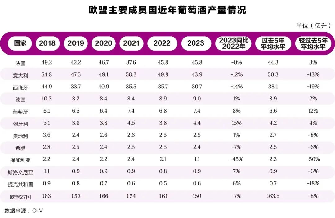 歐盟地區2023年的葡萄酒產量預計為150億升,同比減少11.2億升,比2022年低7%,比過去五年的平均水平低8%。