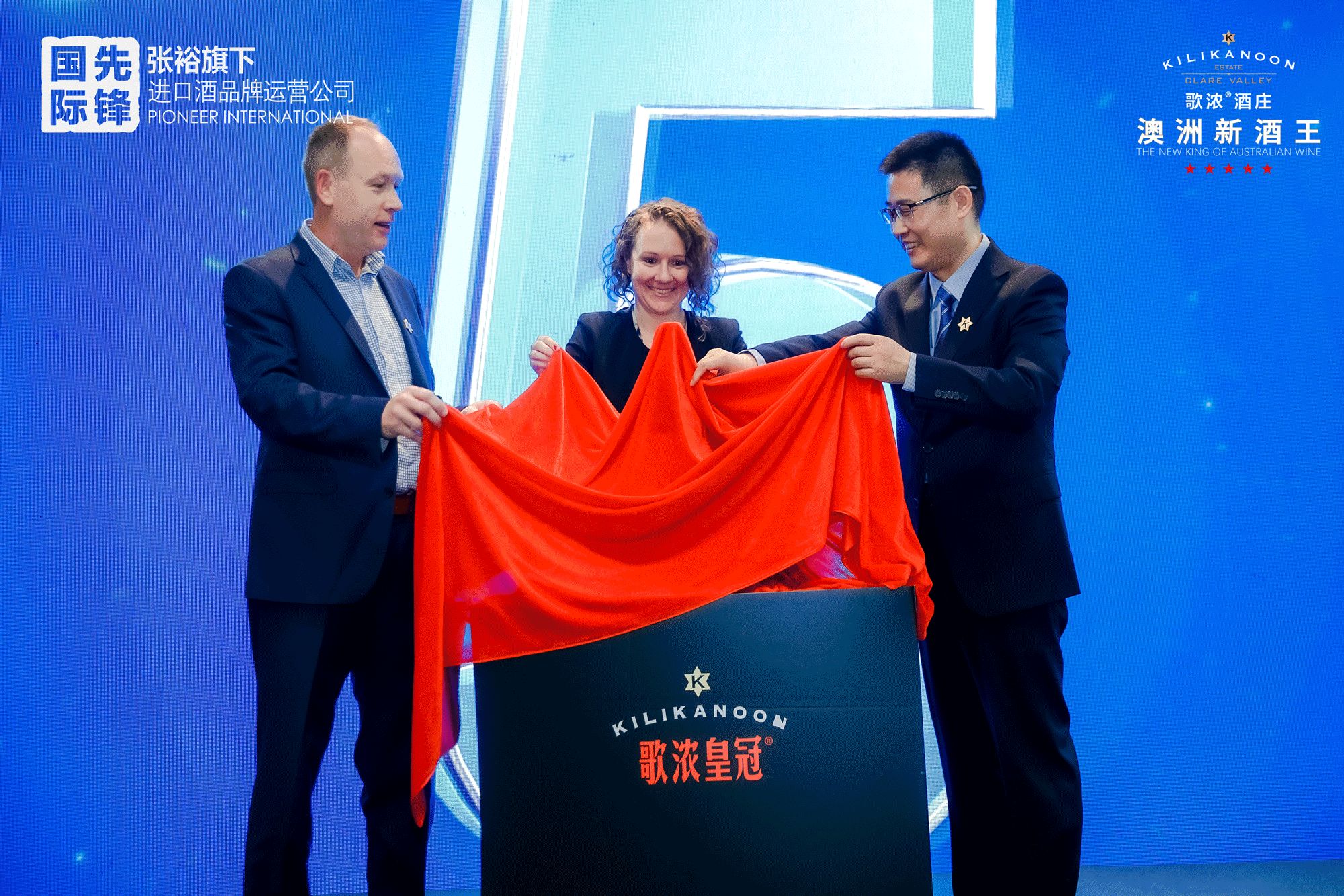 歌濃酒莊總經(jīng)理崔維斯、澳大利亞成都領(lǐng)事館副總領(lǐng)事NINA DYNON以及張裕股份公司總經(jīng)理助理、張裕先鋒國際酒業(yè)有限公司總經(jīng)理劉世祿(從左到右)共同為歌濃皇冠新品揭幕
